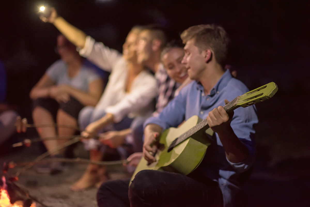 a group of happy young friends relaxing and enjoying summer evening around campfire on the river bank