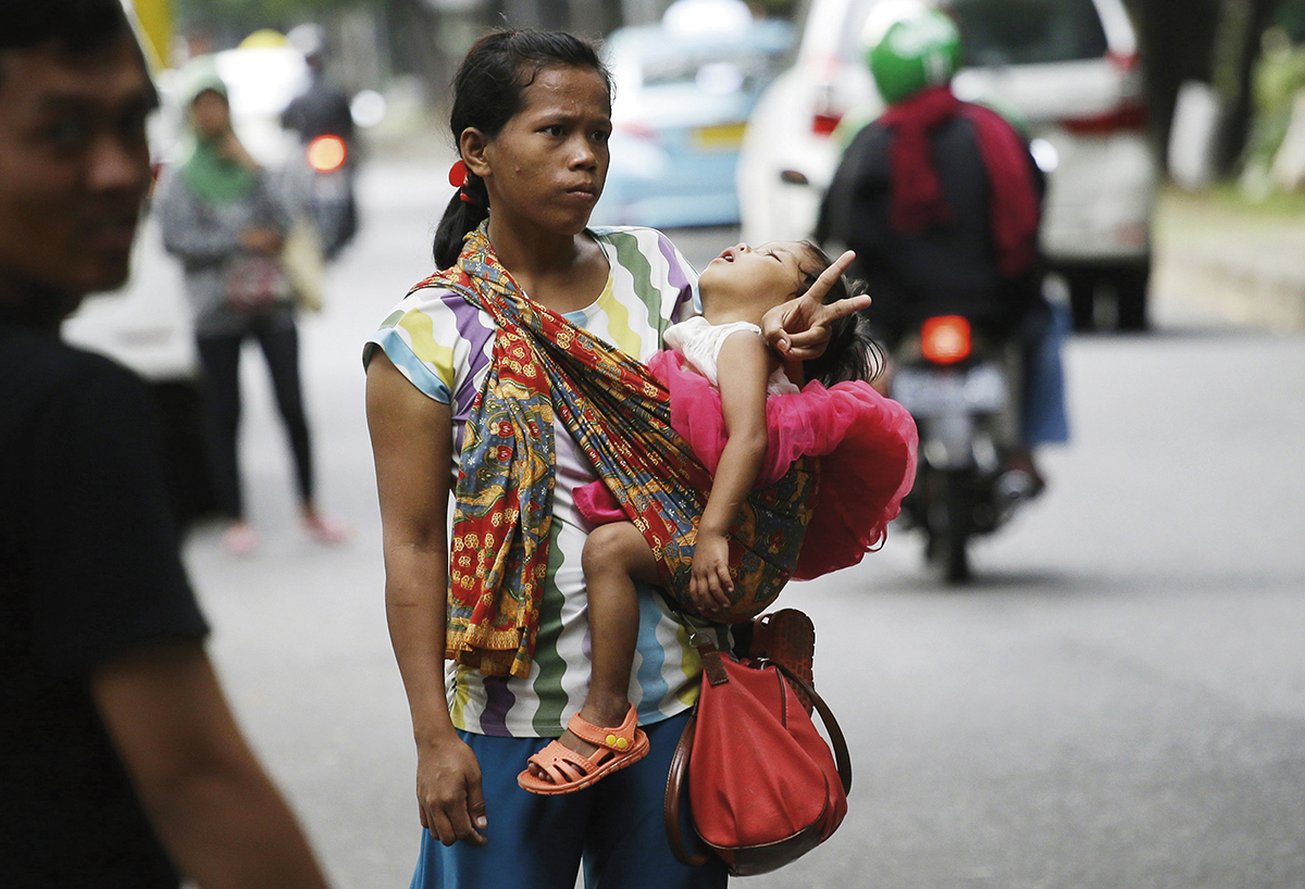 AI101; In this Friday, April 1, 2016, photo, a woman carries her baby as she signals to show that she’s for hire as a ”jockey” to help drivers cheat a peak time traffic rule of three people to one car during rush hour, at the main business district in Jakarta, Indonesia. Traffic clogged Jakarta planned to suspend the peak time traffic rule this week raising concerns among the jockeys that they could lose their way to eke out living. (AP Photo/Achmad Ibrahim) AP / LEHTIKUVA / ACHMAD IBRAHIM