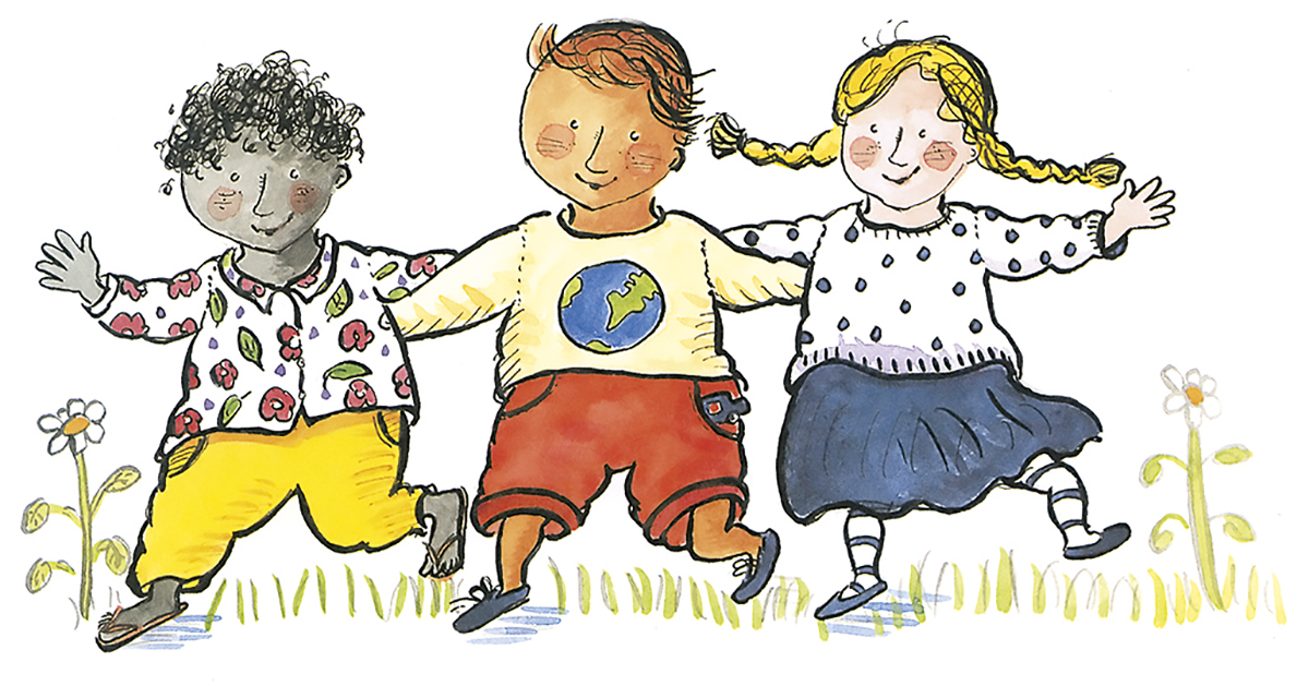 Onneksi kuvitustyylissä on naivistista iloa, muutoin käsi kädessä karkeloivat lapset tuppaisivat jo tuntumaan pateettisilta.