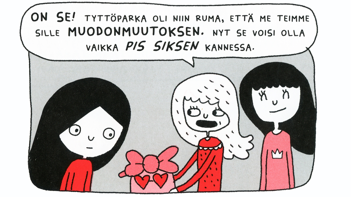 Naapurin kikattavat inhokit, Lalalaa-tytöt, tuovat kirjaan nykykulttuurin reipasta parodiaa. He ahmivat PIS SIS -lehdestä tärkeitä virikkeitä: miten tehdä bikinit spagetista ja mikä on ilmapallohuulten salaisuus.