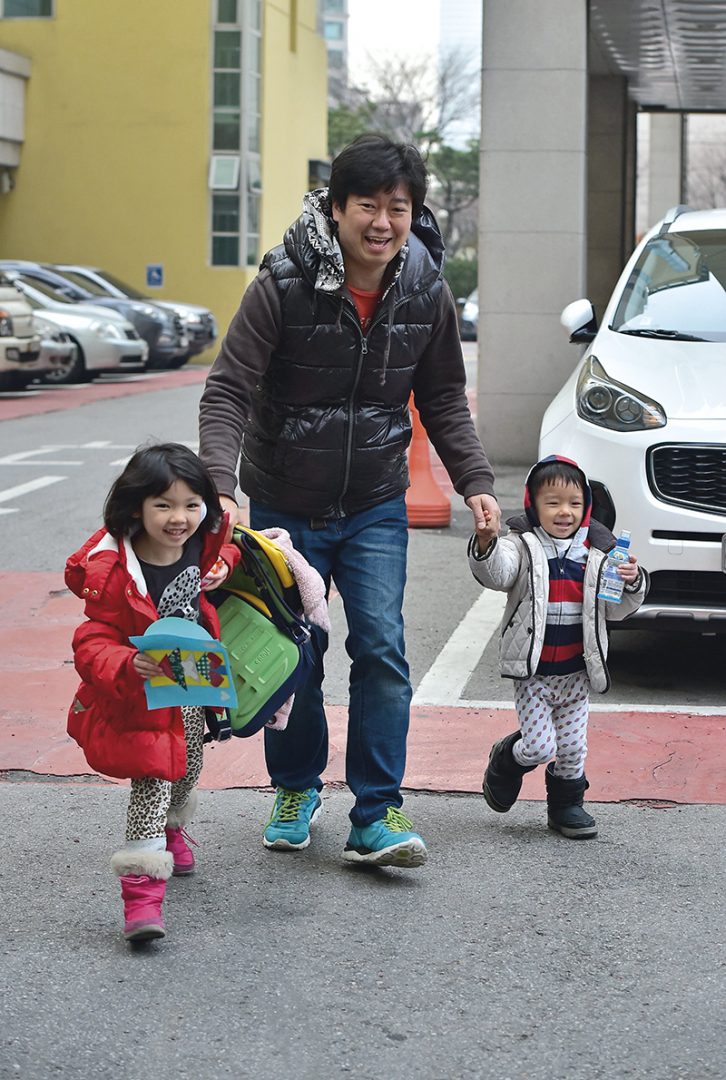 Kim Jin-Sung haki tyttärensä Na-Eunin ja poikansa Won-Woon päiväkodista Soulin keskustassa joulukuun lopulla. Yhä useampi eteläkorealaismies osallistuukin nykyään lastenhoitoon.