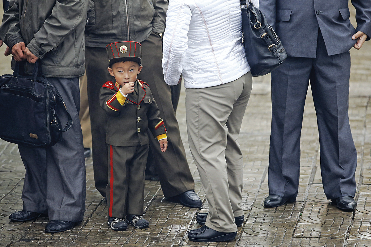 A boy dressed as solider wait for the bus with others in central Pyongyang, October 11, 2015. Isolated North Korea marked the 70th anniversary of its ruling Workers’ Party on Saturday with a massive military parade overseen by leader Kim Jong Un, who said his country was ready to fight any war waged by the United States. REUTERS/Damir Sagolj – RTS3XFL REUTERS / LEHTIKUVA Æ Damir Sagolj / Reuters