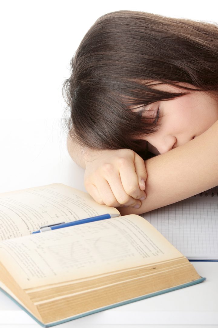 Sleeping while learning – tired teen woman sleeping on desk, over white background