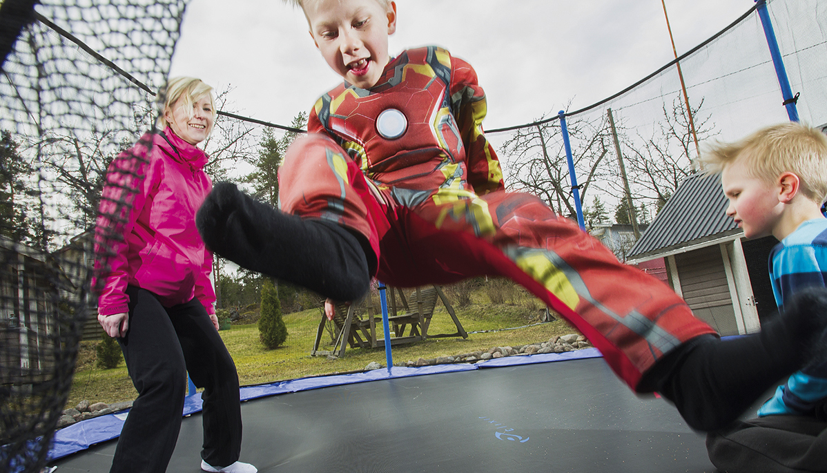 Aapeli näyttää hauskoja temppujaan trampoliinilla. Eemeli odottaa vuoroaan ja Tiina-Johanna kannustaa poikiaan.