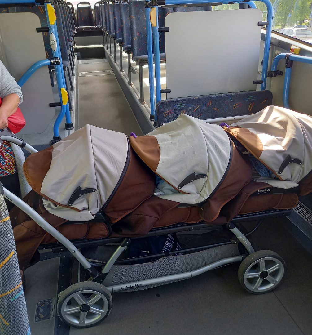 Ensimmäinen bussimatka. Onneksi ei ollut menijöitä bussin takaosaan. Facebookissa Hattutemppu – Kolmoset kerralla -sivulla kuva koko komeudessaan. Kuva: Kirjoittaja