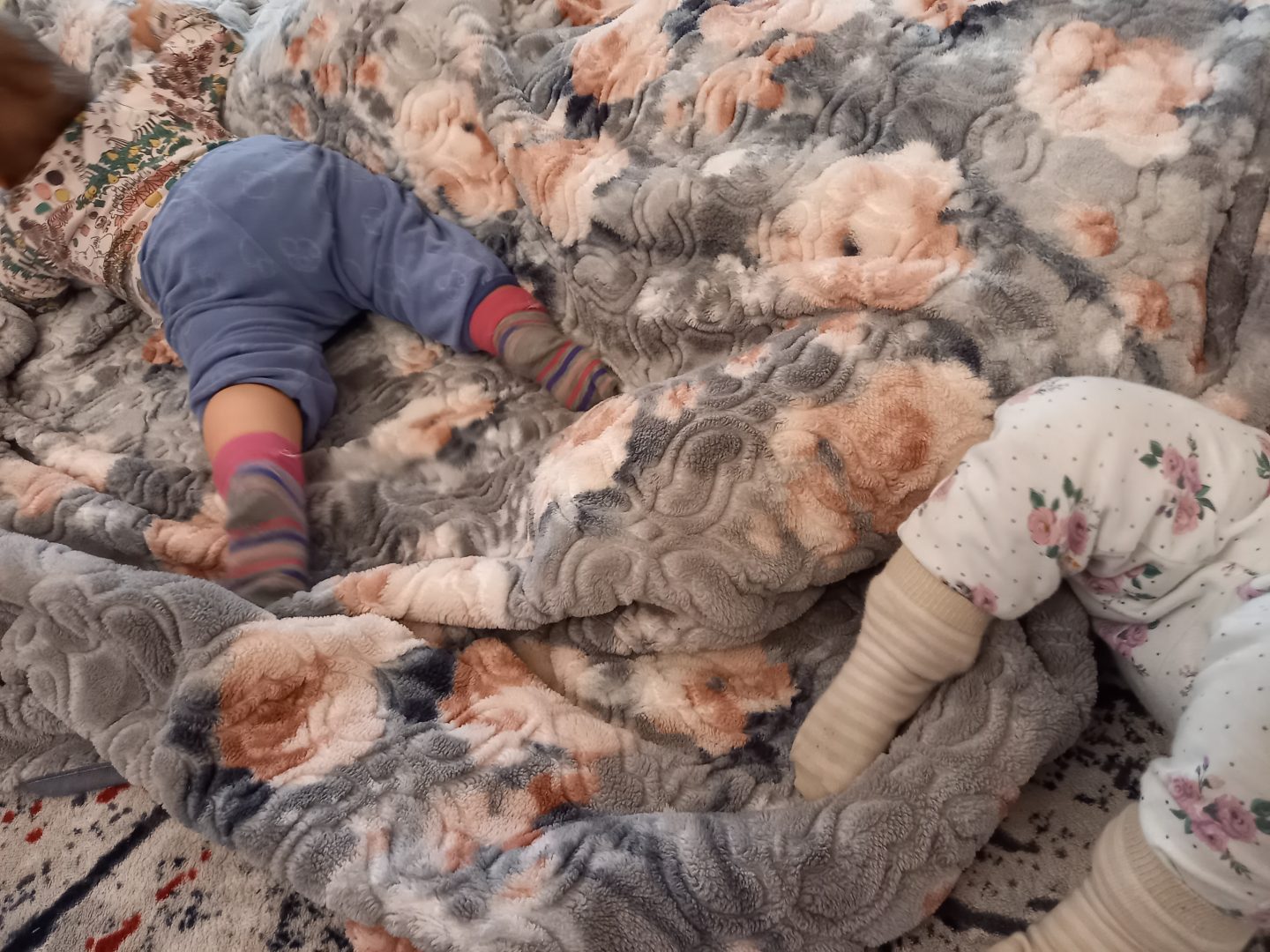 Kuvateksti: Kiipeilytelineenä toimiminen. Paras leikki väsyneelle vanhemmalle. Lattialle makaamaan ja halutessasi peitto päälle. Lapset päälle. Vaatii kärsivällisyyttä kolmen seikkailijan repiessä korvista, työntäessä sormia nenääsi ja kiskoessa hiuksista, mutta ainakin saat olla vaakatasossa.