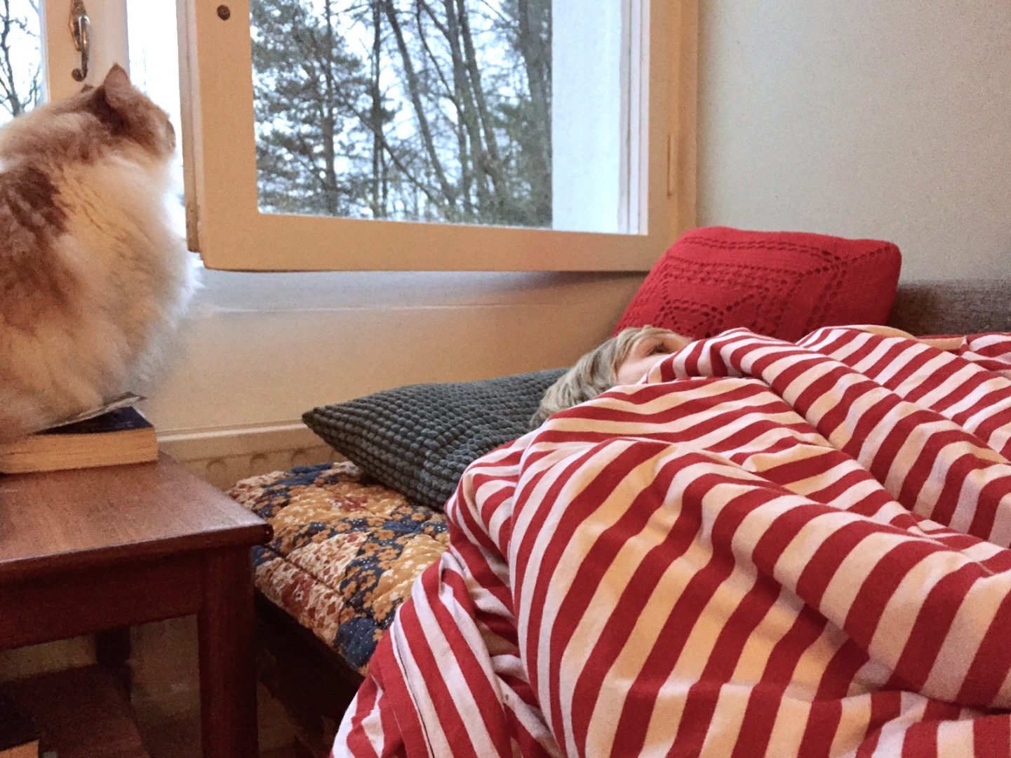 Eri lapset ovat kyllä hyvin erilaisia sairastajia. Sudenkuono on helppo tapaus. Hän makoilee kaikessa rauhassa sohvalla peitto naamalle vedettynä tai leikkii ja puuhastelee vointinsa mukaan itsekseen.