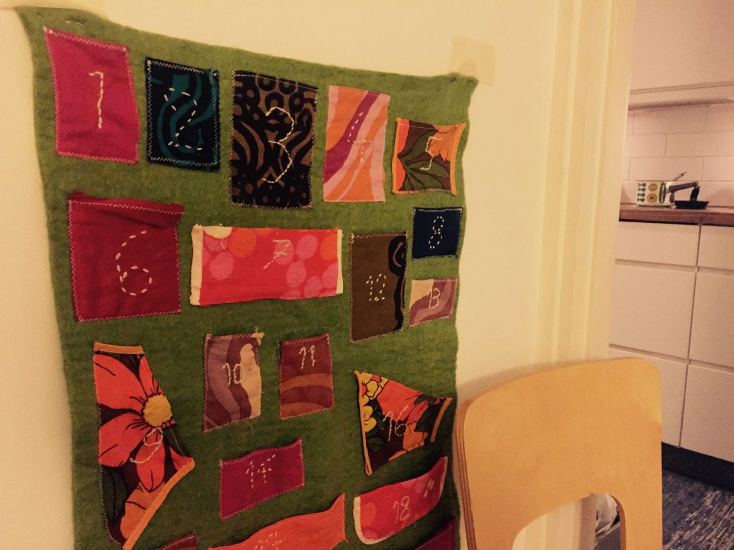 Kiikkuvan kirjapyllyn perheen lapsilla on vanha itse tekemäni joulukalenteri. Se repsottaa ja hapsottaa jo, mutta toimittaa edelleen virkansa hyvin. Kalenterin pieniin pussukoihin tonttu tuo joka yö kaikille perheen lapsille pienen yllätyksen, joka saattaa olla esimerkiksi tarra tai xylitol-purkka.