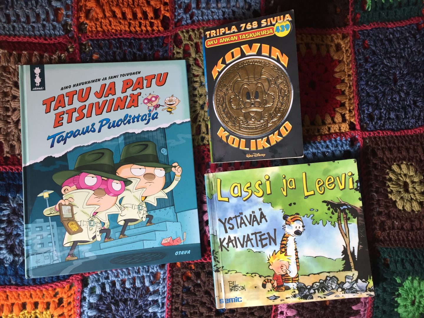 Näillä eväillä tuleva tokaluokkalainen arvelee pärjäävänsä kaksi iltaa teltassa. Tuossa Aku Ankan taskukirjassa yksinään on 768 sivua.