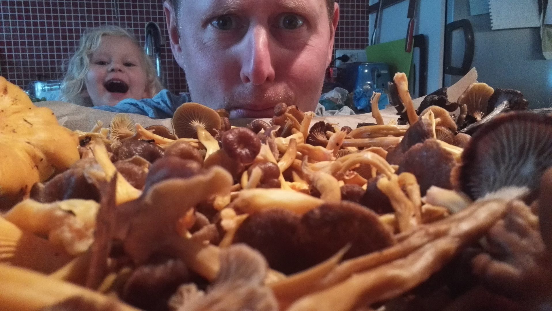 Lapsi nauraa hätääntyneelle keski-ikäiselle