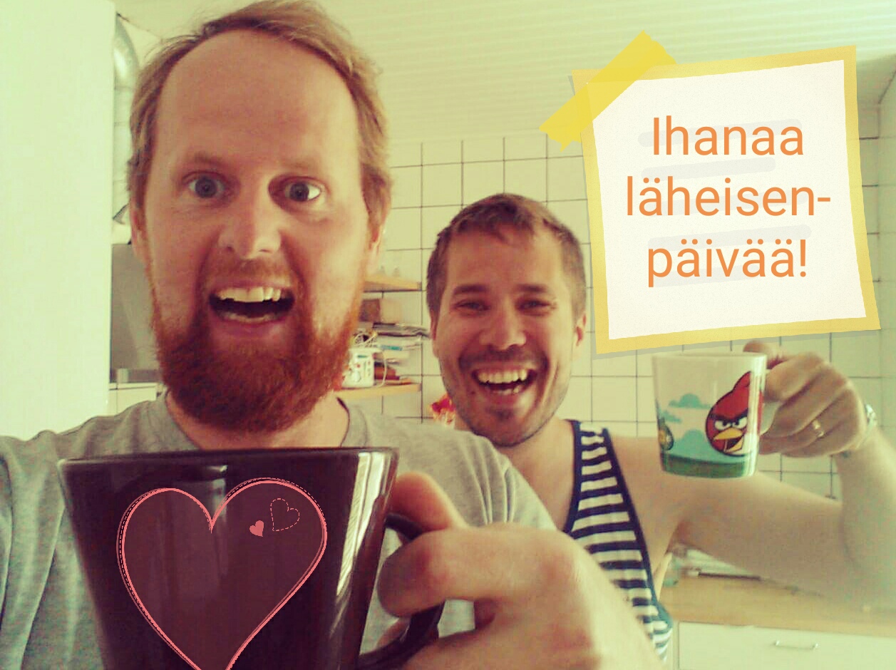 Antti: Kuulostaa ihanalta! Meillä nukutaan läheisenpäivän aamuna pitkään. Kun kaikki ovat omatahtisesti heränneet, kokoonnumme olohuoneen karvamatolle läheispiiriin. Tartumme rakkaita perheenjäseniä käsistä kiinni. Keskelle piiriä sytytämme rauhaa säteilevän läheisentuohuksen ja alamme hyräillä vokaaleja. Painamme silmät kiinni ja tunnustelemme itsessämme, mikä tekeminen alkaa houkutella ja resonoida meissä. Kuuntelemme hellästi sisintämme ja tartumme alitajuntaviesteihin. Tämän enempää en voi kertoa suunnitelmistamme, koska kaikki päätökset syntyvät ryhmänä ja läheisenpäivän aamuna. Yhdessä.