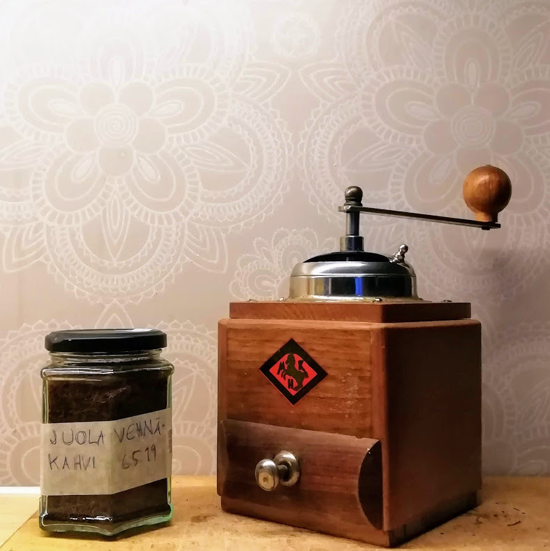Paahtuneet juolavehnän juuret jauhoin vaivalloisesti käsikäyttöisellä kahvimyllyllä.