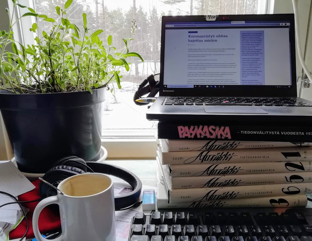 3. Jatkuvat keskeytykset. Maailma on muutenkin jo kylliksi pirstaloitunut, mutta nyt se sirpaloituu erityisellä varmuudella uutisten, viestien tai lasten ”iskä”-huutojen takia. Soittoläksyt pitää videoida, kolmasluokkalaisen enkun tehtävät kuvata ja lähettää opelle, ja ihan kohta pitää taas alkaa tekemään ruokaa. Ja tähän postaukseen uppoutumisen takia unohdin muistuttaa lasta luokkansa videotapaamisesta. Ehkä vaan menen nyt ulos ja hakkaan vähän aikaa päätä leikkimökin seinään.