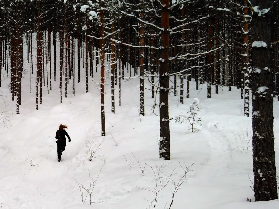 Me oltiin viikonloppuna retkellä metsässä. Siellä oli tosi paljon lunta ja mäki, josta pystyi laskemaan liukurilla mäntyjen välistä hurjaa vauhtia. Lopussa oli hyppyri: tumps! Tuossa kuvassa tyttö on just juoksemassa mäen päälle.