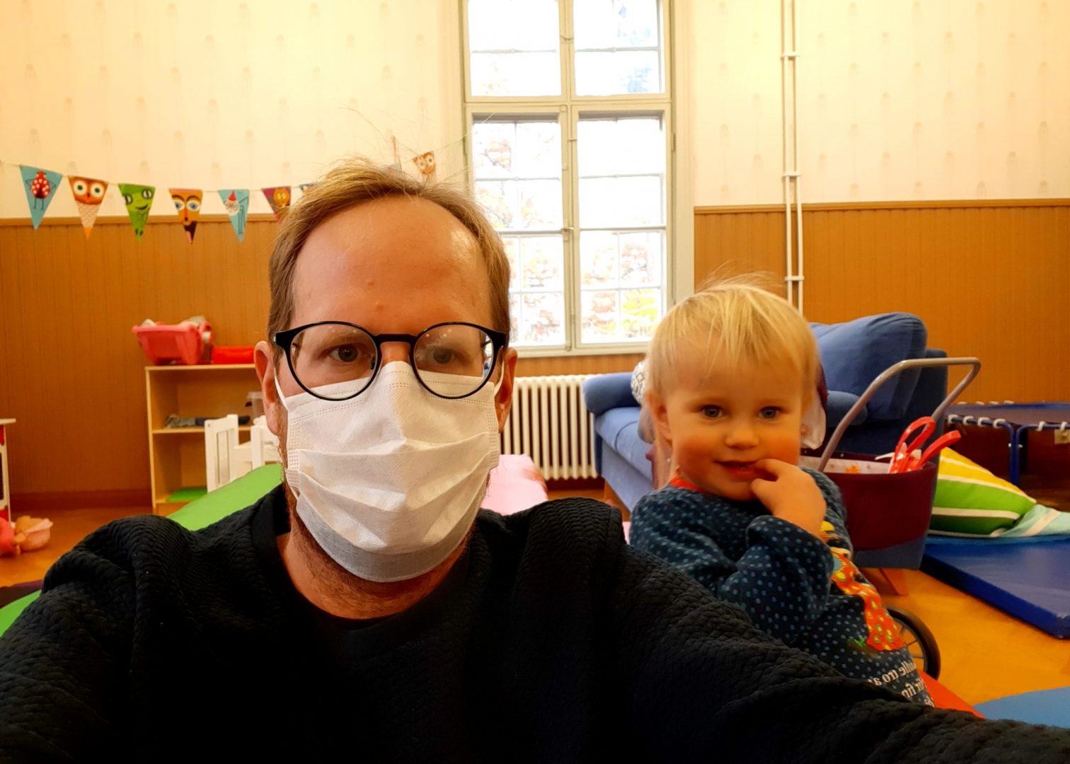 Isä ei osaa asentaa maskia oikein: silmälasit huurtuvat.