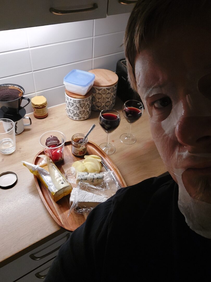 Koska olen luonnostani heittäytyjä – jopa itselleni näin luonnottomissa tilanteissa – päätin vetää päätyyn asti: Illalla, lapsen nukahdettua, laitoin meille vanhemmille juustopöydän, kaadoin lasit viiniä ja läästin naamaani kasvonaamion. Iltapalan lomassa katsoimme Hallmark-jouluelokuvan, jossa jonkin epämääräisen eurooppalaisen monarkian prinssi jää joulun alla jumiin pieneen pohjoisamerikkalaiseen kaupunkiin ja rakastuu paikalliseen sairaanhoitajaan. Jos mennään päätyyn asti, tehdään se sitten kunnolla.