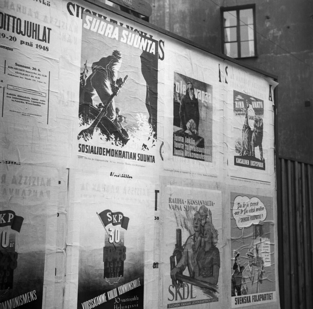 Vaalijulisteita vuonna 1948. Kuvassa vasemmalta oikealle ylärivissä SDP:n, Kokoomuksen ja Kansallisen Edistyspuolueen julisteet, alarivissä SKP:n, SKDL:n ja RKP:n julisteet.