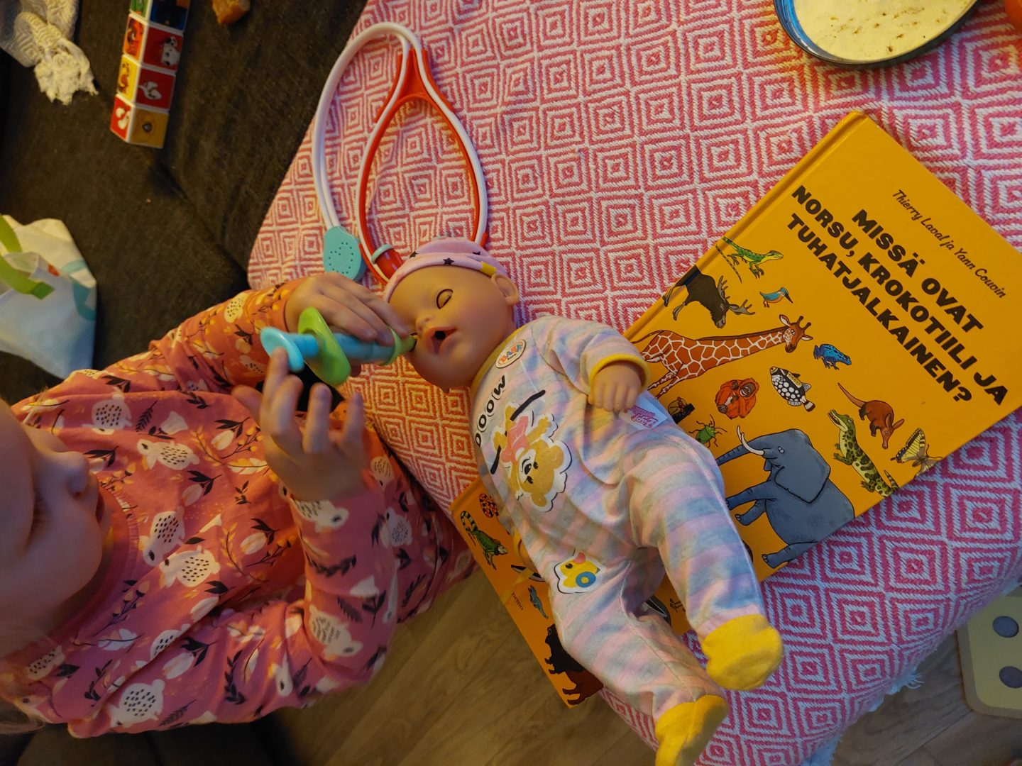 Olen varma, että erityisesti H:n hankkimat lääkärilelut ja -kirjat ovat auttaneet suuresti Saimaa valmistautumaan sairaalareissuihin. Kun esimerkiksi verenpaineen mittaaminen aiheutti aiemmin hysteerisen itkukohtauksen, nyt Tohtori Saima haluaa mitata verenpaineen sekä itseltään että vanhemmiltaan. Myös kuumeen mittaaminen oli aiemmin hirvitys, mutta nyt, kun H on flunssassa, haluaa samainen tohtori mitata koko perheen lämmön korvamittarilla. Jos vaatimuksiin ei suostuta alkaa armoton huuto ja sätkiminen lattialla: “Ite, pite, itepitepite!”