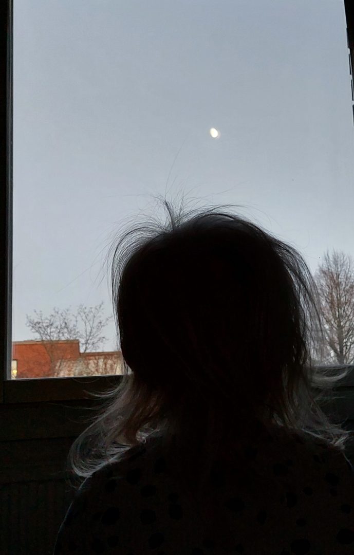 ”Isi, siellä on kuu! Siellä se möllöttelee. Taivaalla!”