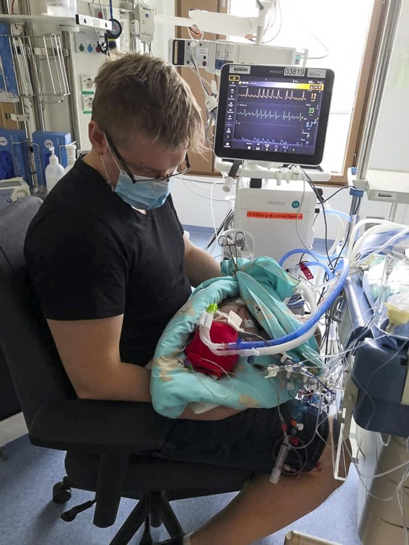 Kävimme katsomassa vauvaa heti leikkausta seuraavana päivänä. Meitä oltiin varoitettu, että näky saattaa olla järkyttävä, mutta olin niin iloinen kaikesta, etteivät letkut ja turvotus minua juuri häirinneet. Lapsen rinta oli jätetty pariksi vuorokaudeksi auki, ja avointa rintalastaa peitti vain ohut folion tai sellofaanin kaltainen kalvo, jonka läpi kuulsi sykkivä sydän. Ilahduin joka kerta, kun kalvo nousi sydämenlyönnin mukana.