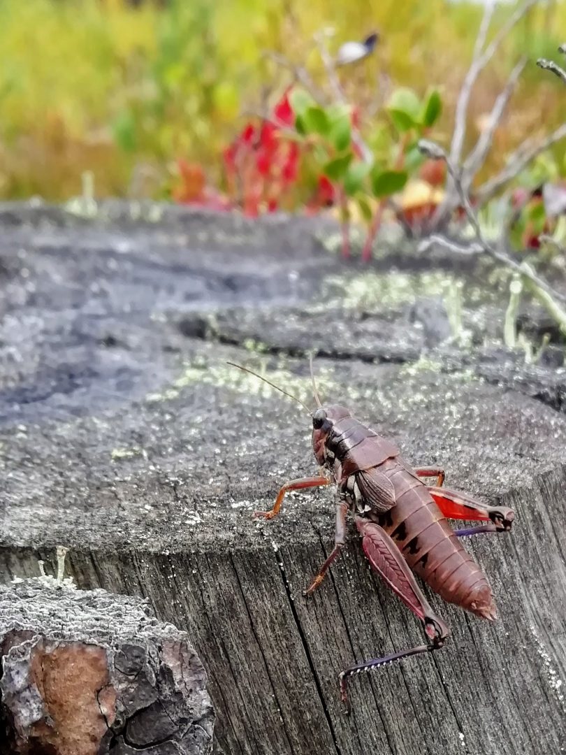 Heinäsirkka syyskuisella hakkuuaukealla. Ehkäpä ketoheinäsirkka.