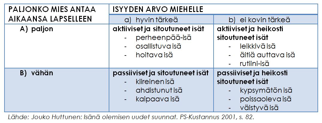 Omaa isyyttä voi miettiä suomalaisen isyystutkimuksen uranuurtajan Jouko Huttusen taulukon avulla. Huttunen jakaa isät neljään ryhmään sen mukaan, kuinka paljon he antavat isyydelle arvoa ja kuinka paljon he antavat lapselle aikaa.