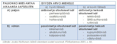Aktiiviset ja sitoutuneet isät (ruutu Aa) voivat olla Noljakanfaijan tai LattePapan kaltaisia pehmo-hoivaisiä, mutta toki on myös muunlaisia tapoja olla aktiivinen ja sitoutunut. Aktiiviset ja heikosti sitoutuneet isät (ruutu Ab) viettävät aikaa lasten kanssa, mutta isyys ei kuulu heidän elämänsä tärkeimpiin asioihin. Passiiviset ja sitoutuneet isät (ruutu Ba) ovat sisäisesti ristiriitaisessa tilanteessa: vaikka isyys on heille tärkeää, he eivät syystä tai toisesta pysty tai halua toteuttaa sitä. Passiiviset ja heikosti sitoutuneet isät (ruutu Bb) ovat joutuneet tai ajautuneet tilanteeseen, jossa heitä ei juuri lapsen elämässä näy.
