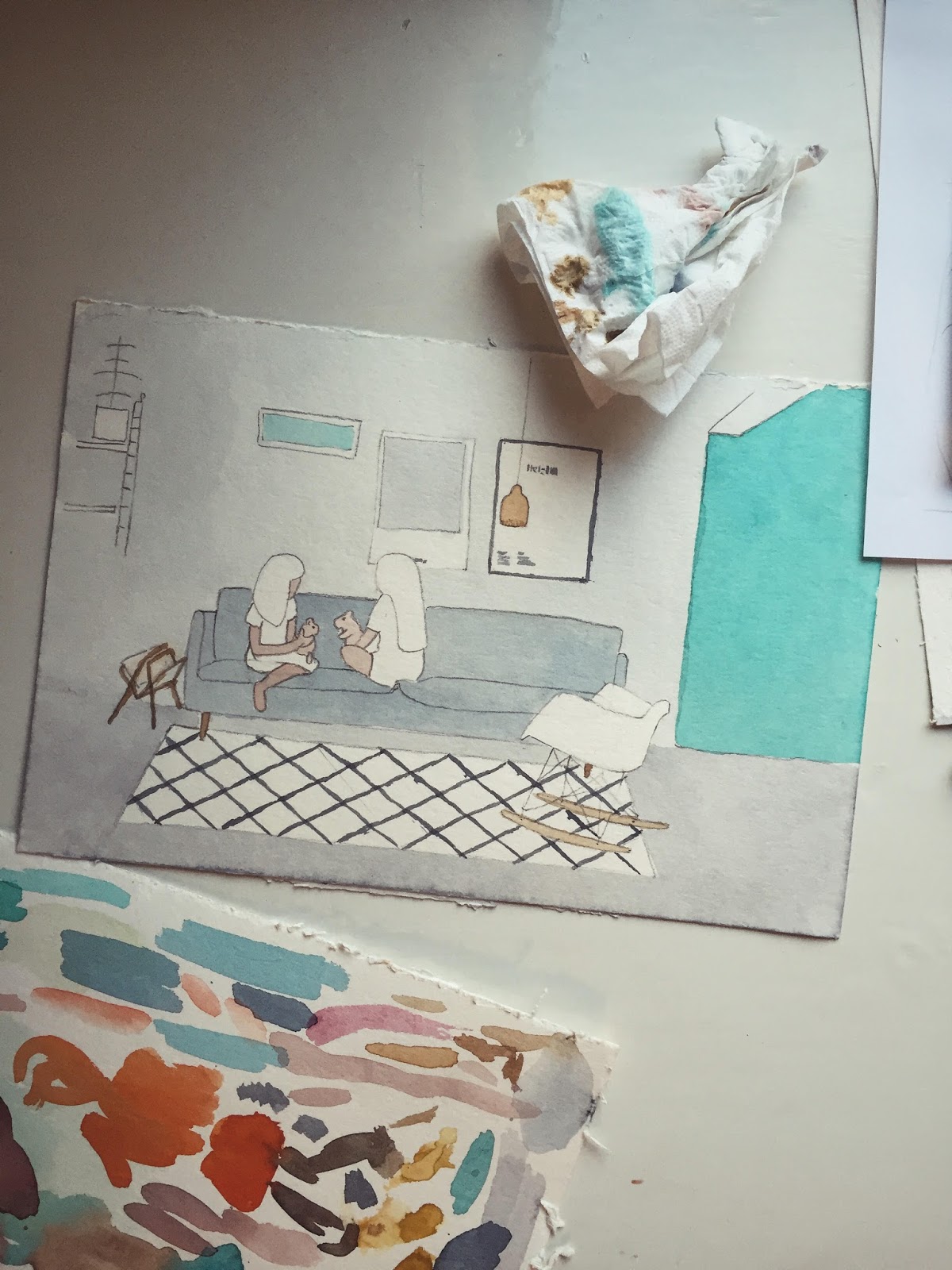 Lapsia ei tarvitse houkutella. He tunnistavat jo tarkoin varjellut akvarellipaperini ja tietävät, että se toimii vesivärien kanssa aivan eri tavalla, kuin Clas Ohlsonilta ostettu kopiopaperi. Levitämme veden papereille pullasudilla ja odotamme hetken sen imeytymistä. Sekoitamme siveltimiimme kirkkaita värejä ja maalamme auringonlaskun maisemaa. Kirkas, sinooperinpunainen väri imeytyy puuvillakuituiseen paperiin ja leviää karkealla pinnalla miellyttävän hitaasti ja määrätietoisesti. Se sulautuu kadmiuminkeltaiseen ja preussinsiniseen vaivattomasti ja vääjäämättömästi. Värien rajapinnassa näemme ilotulituksen. Tämän ihmeen äärellä olemme hetken läsnä. Kuvan maalauksista ehtii jakaa Instagramiin myöhemmin. Myönnän, käsi kävi jo puhelimella ja alan miettiä pikkunokkelaa saatetekstiä kuvalle.