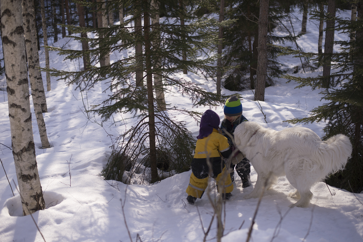 Ja tässä maisemassa, tässä häikäisevässä valkeudessa, minä hymyilen ja katselen lapsiamme, rinnassani läikähtää onni siitä että lapsemme saavat kokea tämän kaiken saman. Saavat mahdollisuuden luoda ne samat juuret. Oppia kuulemaan ne samat metsien henkäykset ja purojen solinat jotka siivittivät meidän lapsuutemme talvipäiviä ja loputtomalta tuntuvia kesiä.