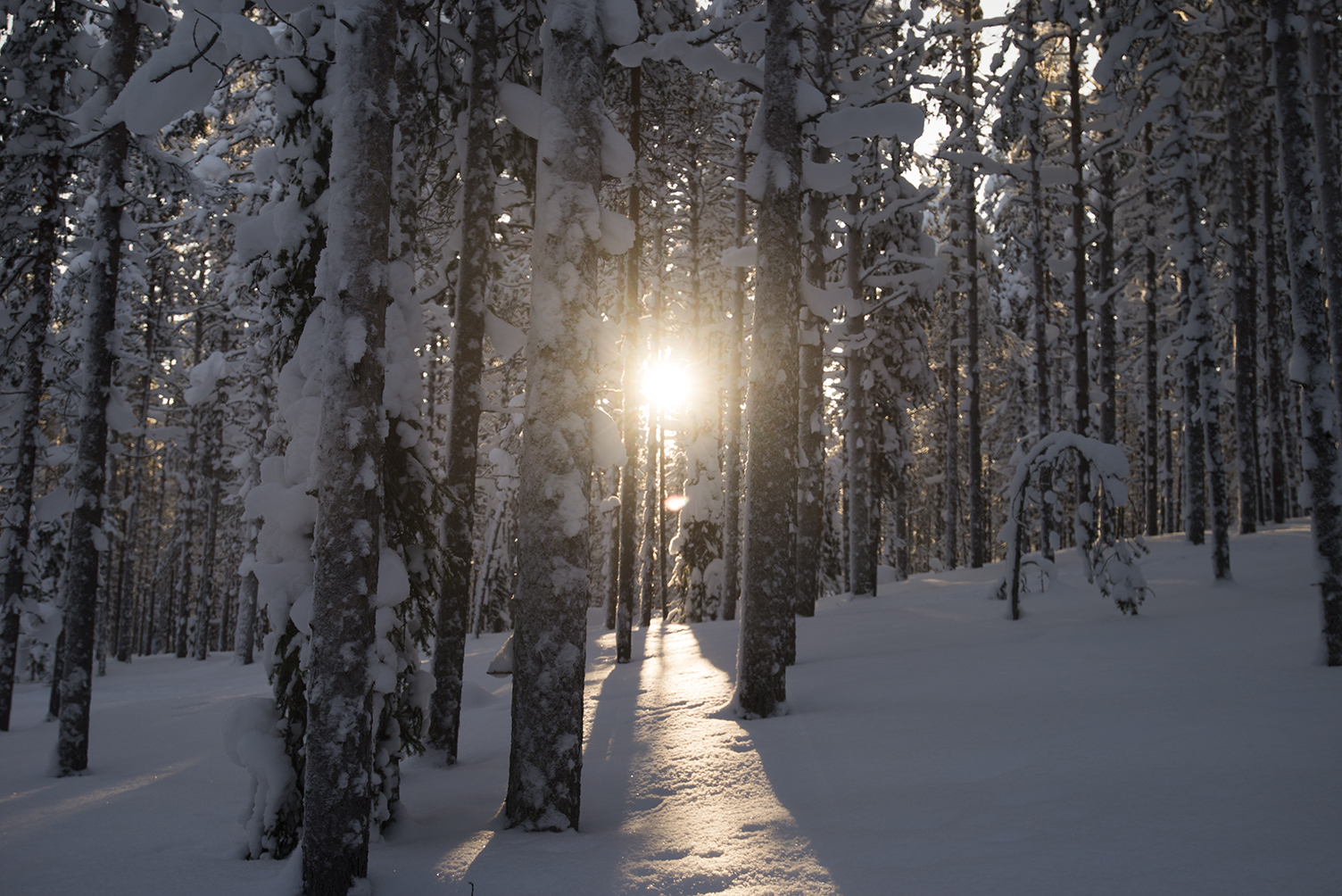 Aurinko aloittaa laskunsa kohti horisonttia samaan aikaan kun me aloitamme laskumme kohti tunturin juurta. Läpi lumisen metsän, toisella puolella siintää yksi tunturi, toisen laitaa laskeudumme. Taivas värjäytyy ensin keltaiseksi sitten hitaasti pastellinoranssiksi.