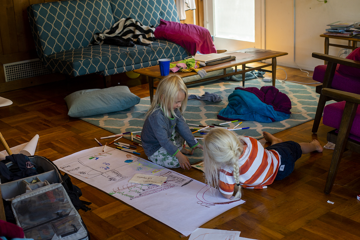 Sisällä ruokapöydässä on sekaisin ketsuppipullot, värityskirjat, läppäri, kamera ja 50 värikynää kaatuneena pitkin poikin.