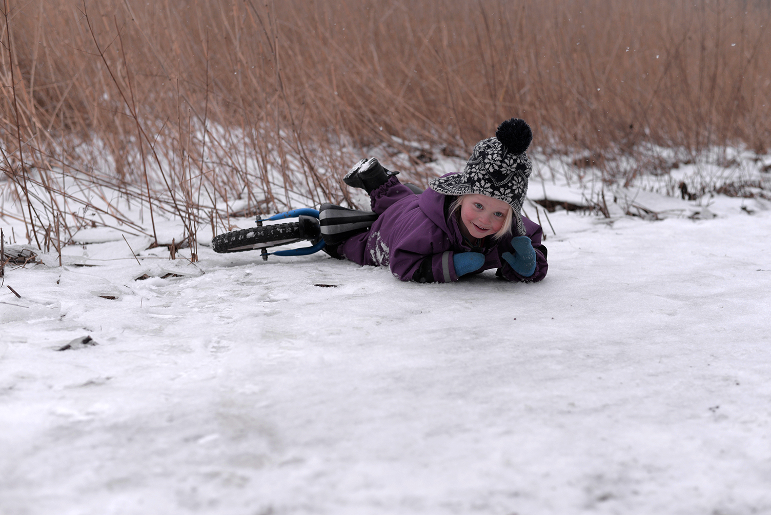 “Jalkoja väsyttää, haalarissa on hankala polkea” Esikoinen sanoo.