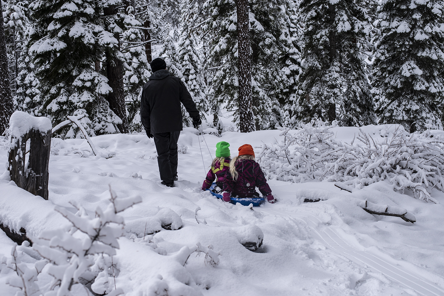 Äänet katoavat, on vain sininen taivas, valkoinen lumi ja havupuut.
