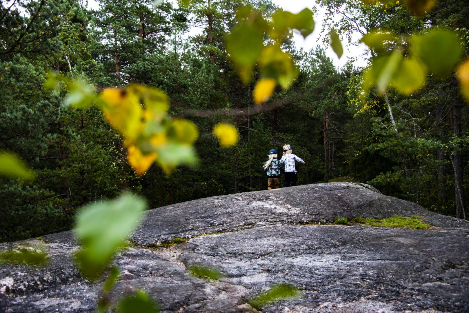 Sade alkaa viimeisillä minuuteilla ennen luontopolun loppumista. Se ropisee kuusen oksista hiljaa ja lempeästi olkapäillemme. Ohimennen näin jo Puolison hymynkin. Puiden takana häämöttää kahvila, jonka ulkoterassille istahdamme syömään karjalanpiirakoita ja juomaan teetä. Katselen pientä retkiseuruetta, tätä joukkoita jonka voimin me olemme nämä mantereiden ylitse vievät matkat kulkeneet.