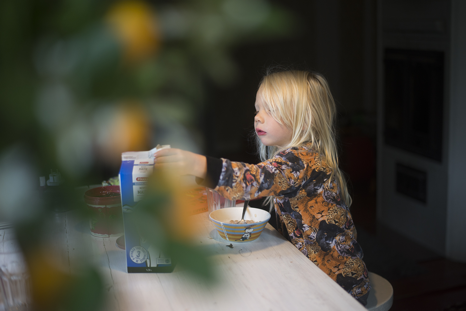 Lapset kiistelevät ja juoksevat malttamattomina edestakaisin keittiön punaruskealla lattialla. Istuvat hetken silittämässä kissaa, kampeavat itsensä sitten aamupalapöydän ääreen.