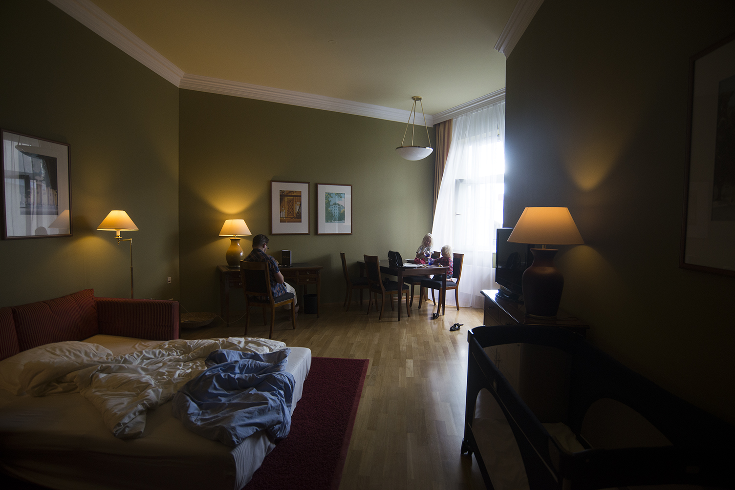 Hotellin valkeat lakanat, sinapinväriset verhot ja sininen mineraalivesipullo.