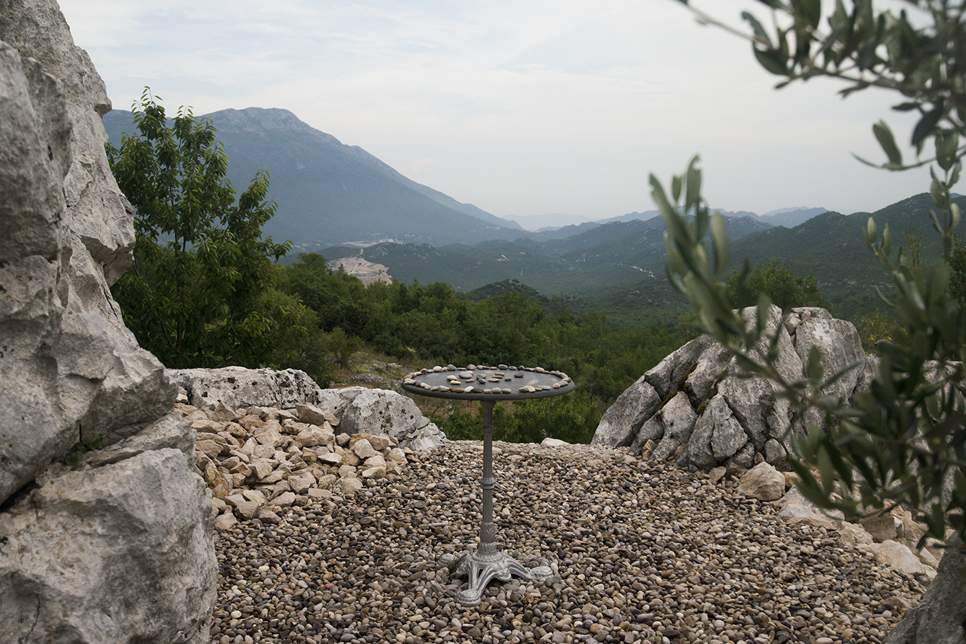 Vuoret siintävät sinisenä kaukaisuudessa. Lähellä harmaan ja kerman värinen kallio levittäytyy pihan ympärille. Kuuma aurinko nostaa salvian tuoksun nenääni ja ohitseni lentää perhonen.