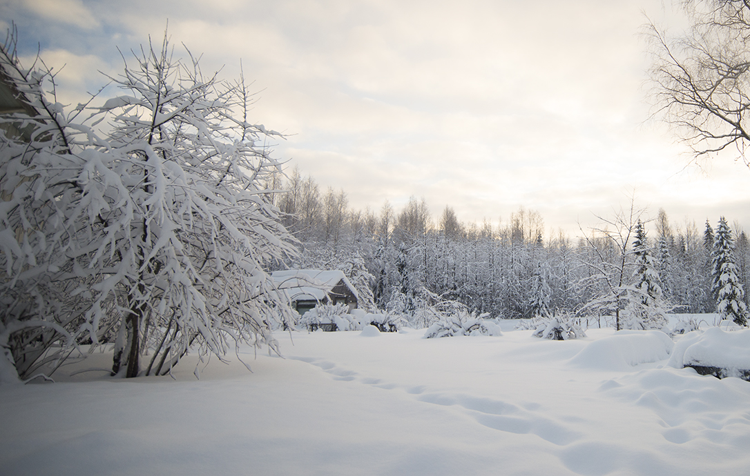 Kuusten helmat roikkuvat kohti maata valkoisen massan painosta, pimeyskään ei mustaa kuten etelässä lumen valaistessa ympärillä.