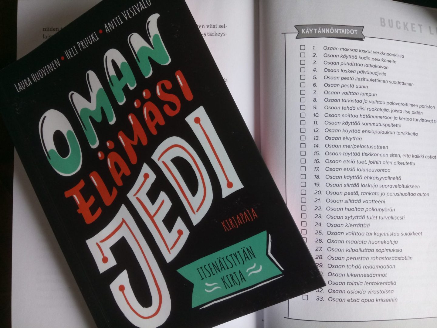 Aivan kirjan lopussa on listattu 99 käytännön ja hyvinvoinnin taitoa, joista saa niin sanottuja ”aikuispisteitä”. Kun pisteitä on koossa 100, osaa hallita omaa elämäänsä eli on oman elämänsä jedi. Tätä listaa voisi käydä läpi jo ennen kotoa muuttoa ja asettaa tärkeimpiä käytännön taitoja tavoitteeksi, kuten että nuori osaa hakea apua kriisitilanteessa, varata lääkäriajan ja osaa laittaa vähintään viisi ruokaa, joista pitää.