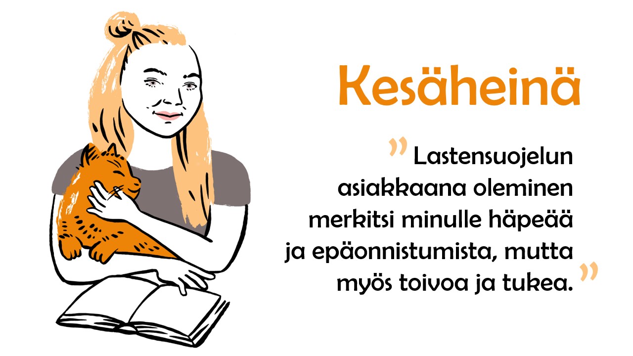 Kesäheinä Kesäheinä on parikymppinen yliopistoon pyrkivä helsinkiläinen, joka on kokenut vajaassa kymmenessä vuodessa kaikki lastensuojelun vaiheet avohuollosta ja sijoituksesta kotiutuksen kautta jälkihuoltoon. Kesäheinän tekevät onnelliseksi hitaat sunnuntaipäivät, syksyn kauneus ja uudet mahdollisuudet. ”Lastensuojelun asiakkaana oleminen merkitsi minulle häpeää ja epäonnistumista, mutta myös toivoa ja tukea.” [caption id="attachment_31613" align="alignnone" width="300"]Kuva: Aino Sutinen[/caption]